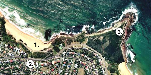 Still within easy walking to the north of Turrimetta Headland (3.), another beach, Warriewood (1.), and above the beach, a selection of restaurants (2.).
