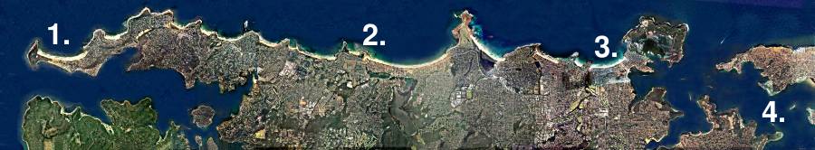 The northern coastline starting at Manly (3.) up to Palm Beach (1.) is a mixture of rocky headlands sandy beaches and enchanting bushland. Add to this the inner northern harbour of Pittwater with a National Park for its western shore, and you have a concentrated package the locals enjoy each day, and always hope the secret of just how good it is, never gets out. But you can enjoy it all right from the centre of the action at Warriewood (2.).